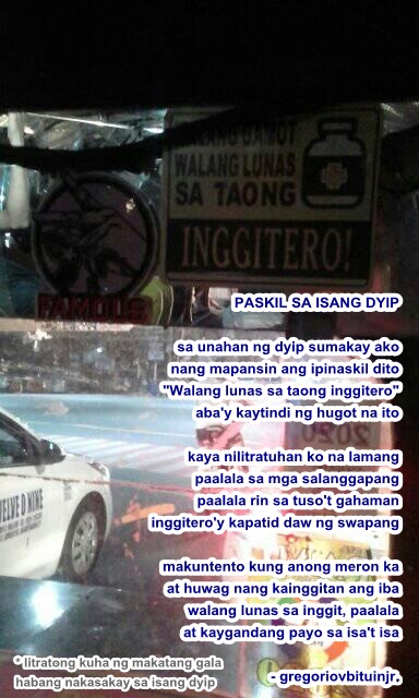 "Aba’y may ganyang lipunan pala noon." Sabi ni Igme, maralitang nangunguha ng mga tirang pagkain sa Jolibe at Makdo, at huhugasan upang iluto muli, na mas kilala sa pagpag.